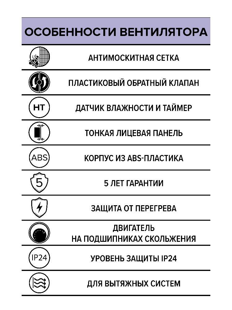 Вентилятор применяется для постоянной и периодической вентиляции санузлов, ванных комнат, кухонь и других бытовых помещений. Вентилятор отвечает самым строгим стандартам качества и безопасности. Уровень защиты – IP24. Двигатель на подшипниках скольжения не требует дополнительного обслуживания и гарантирует эффективное удаление влажного и загрязненного воздуха. Вентилятор оснащен одноразовым предохранителем для предотвращения возникновения короткого замыкания, обратным клапаном для предотвращения попадания пыли и запахов из вентиляционного канала, антимоскитной сеткой, которая защищает помещение от проникновения насекомых и грязи из шахты. Вентилятор включится, когда встроенный датчик зафиксирует превышение заданного уровня влажности. Устройство снизит его до установленного значения, после чего проработает еще 15 мин. и выключится. По умолчанию установлено значение влажности в 70 %, при желании его можно изменить на 50 или 90 %. Время работы по таймеру также можно изменить на 5 или 30 мин. Корпус выполнен из высококачественного и прочного ABS-пластика, который надежно прослужит весь срок использования и не пожелтеет. Благодаря сверхтонкой лицевой панели вентилятор монтируется практически вровень со стеной. Монтаж осуществляется с помощью саморезов.